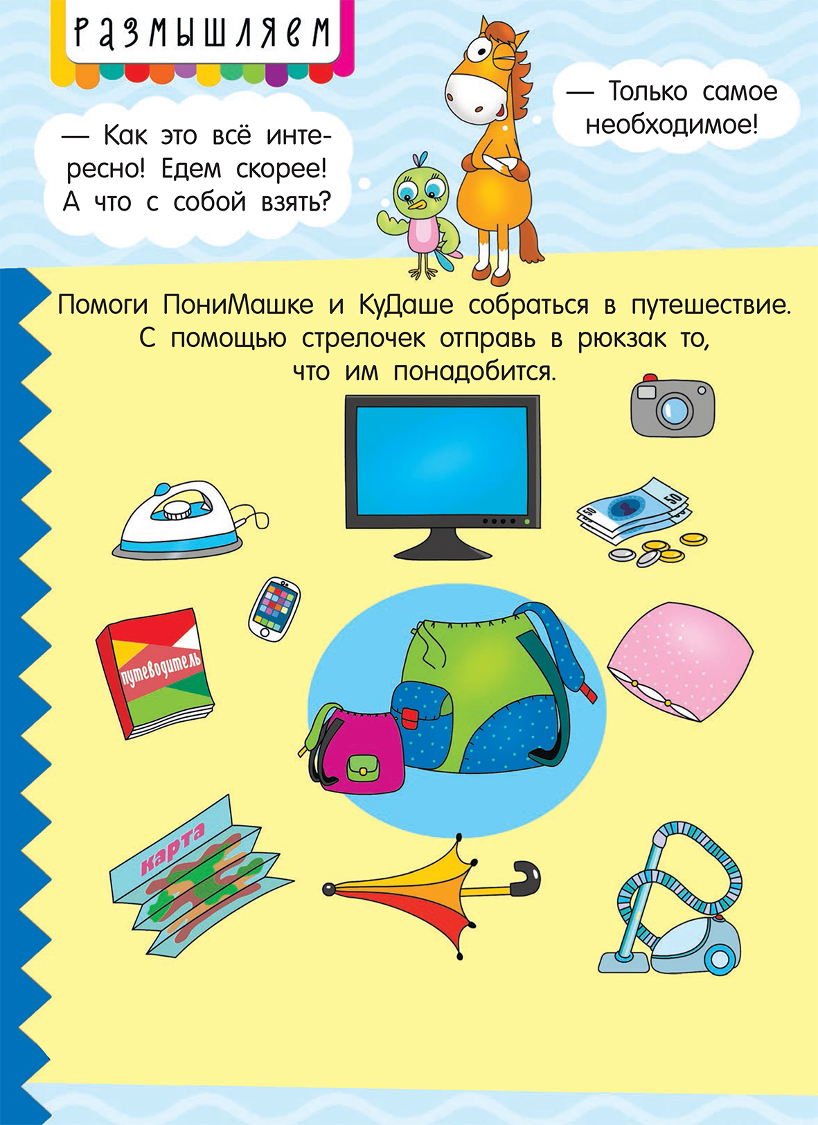 ПониМашка с Кудашей отправляются в путешествие по Золотому кольцу. Давайте, поможем им собрать только нужные для поездки вещи. Распечатайте с ребенком картинку, возьмите фломастеры и стрелочками соберите в рюкзак все самое необходимое. Обсудите с ребенком, чтобы он бы взял с собой в путешествие. Пофантазируйте, куда бы вы хотели отправиться.