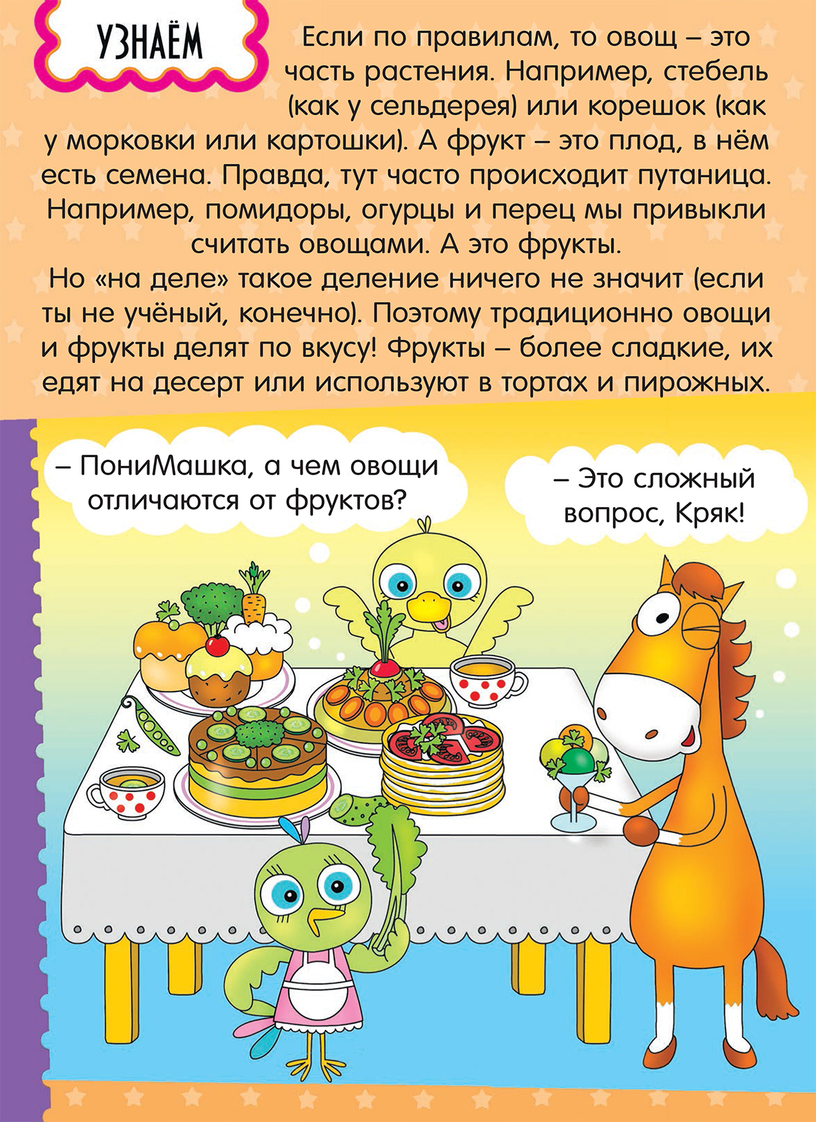 Маленькие дети очень любопытны. Мамы детей в возрасте 3-4 лет слышат вопросы “почему?”, “зачем?”, “а это что?” каждые 10 минут. И тут главное родителю быстро сориентироваться и ответить на вопрос. Вот вы знаете, чем фрукт отличается от овоща? ПониМашка нам поможет с ответом.