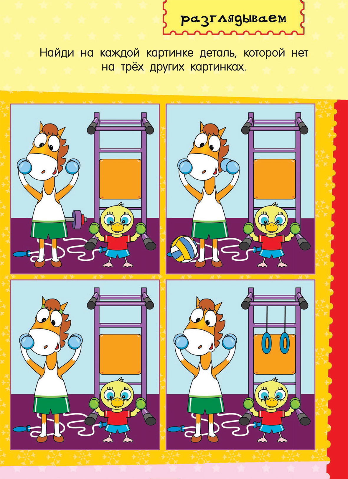Это задание для самых внимательных детей и родителей. Вы видите 4 картинки, которые практически одинаковые. У них есть только одно отличие. На каждой картинке есть одна деталь, которой нет на трех других. Надо очень внимательно посмотреть на каждую картинку и найти эти детали. Но не останавливайтесь на этом - с любой нашей картинкой можно работать разными способами. Например, можно пофантазировать с ребенком, что делают герои картинки и о чем они говорят. Можно поговорить с ребенком, зачем делать зарядку и какая зарядка ему нравится. А можно достать мячики и скакалки и вместе с ПониМашкой и Кряком сделать зарядку.