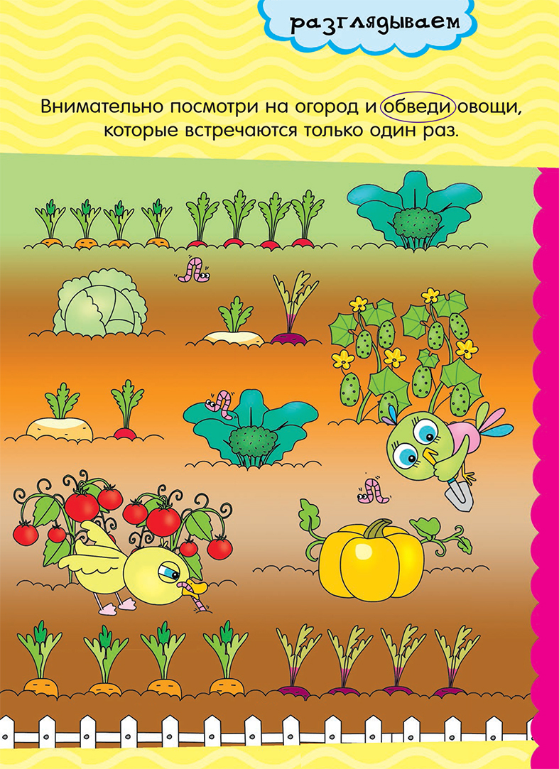 Посмотрите с ребенком внимательно на картинку. Сначала назовите все овощи, которые выросли в нашем огороде. А теперь посчитайте их. Те, что только в одном экземпляре - обводите.