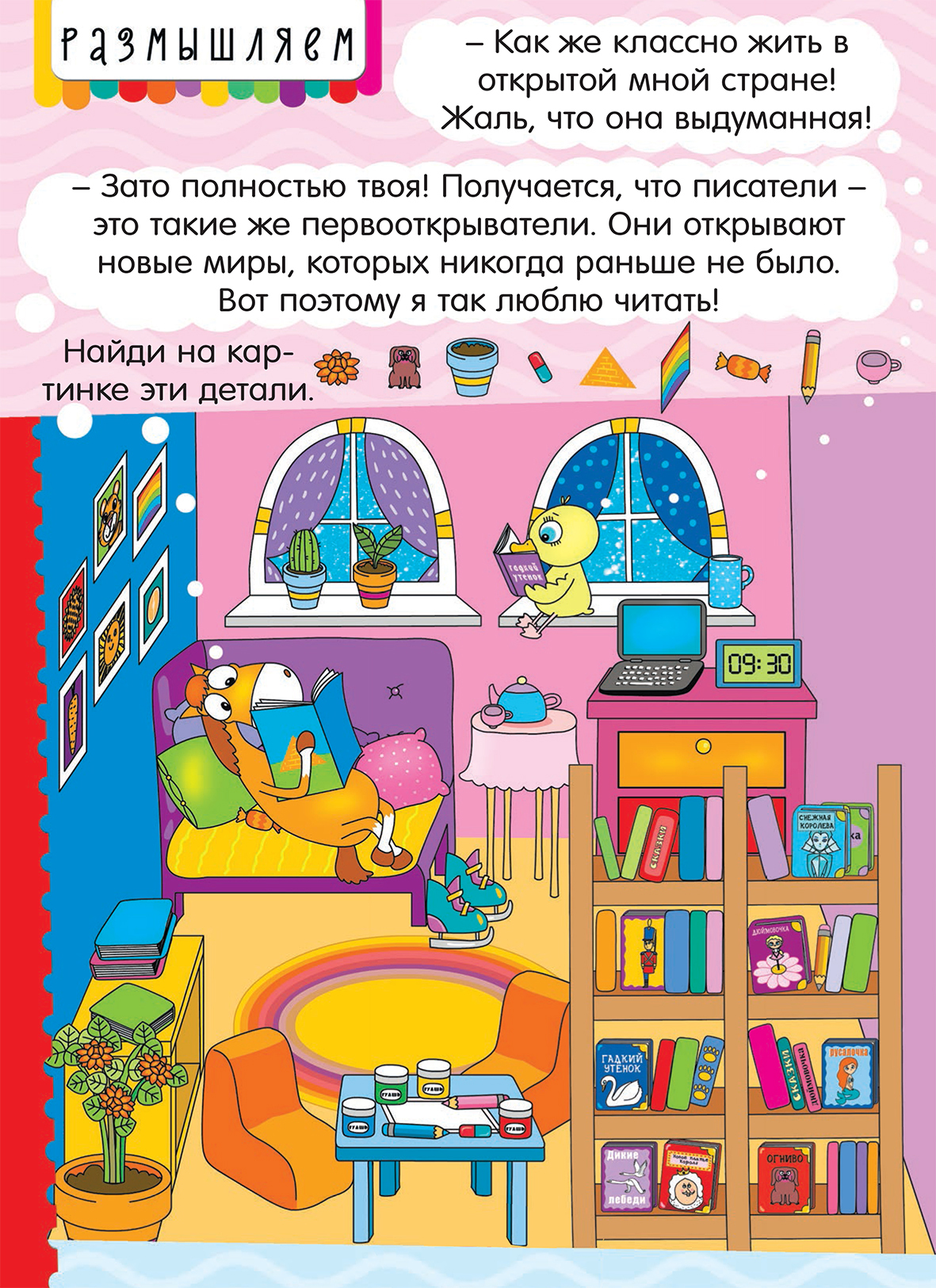 Упражнение для самых внимательных детей и родителей! Сначала рассмотрите перечисленные над картинкой детали. Пусть ребёнок назовёт каждую из них; подскажите ему, если он не узнаёт или забыл какой-то предмет. Затем ребёнок должен внимательно изучить картинку и найти требуемые детали.