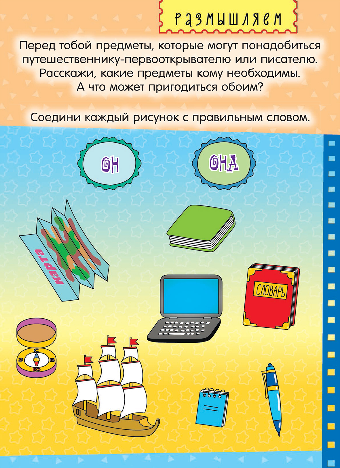Это задание направлено на развитие речи и внимания. Рассмотрите с ребёнком картинки и подумайте, какой предмет пригодится путешественнику, а какой писателю. Некоторыми вещами могут воспользоваться оба! Пусть ребёнок соединит каждый рисунок с правильным словом. Попросите его рассказать, что люди могут делать при помощи этих предметов.