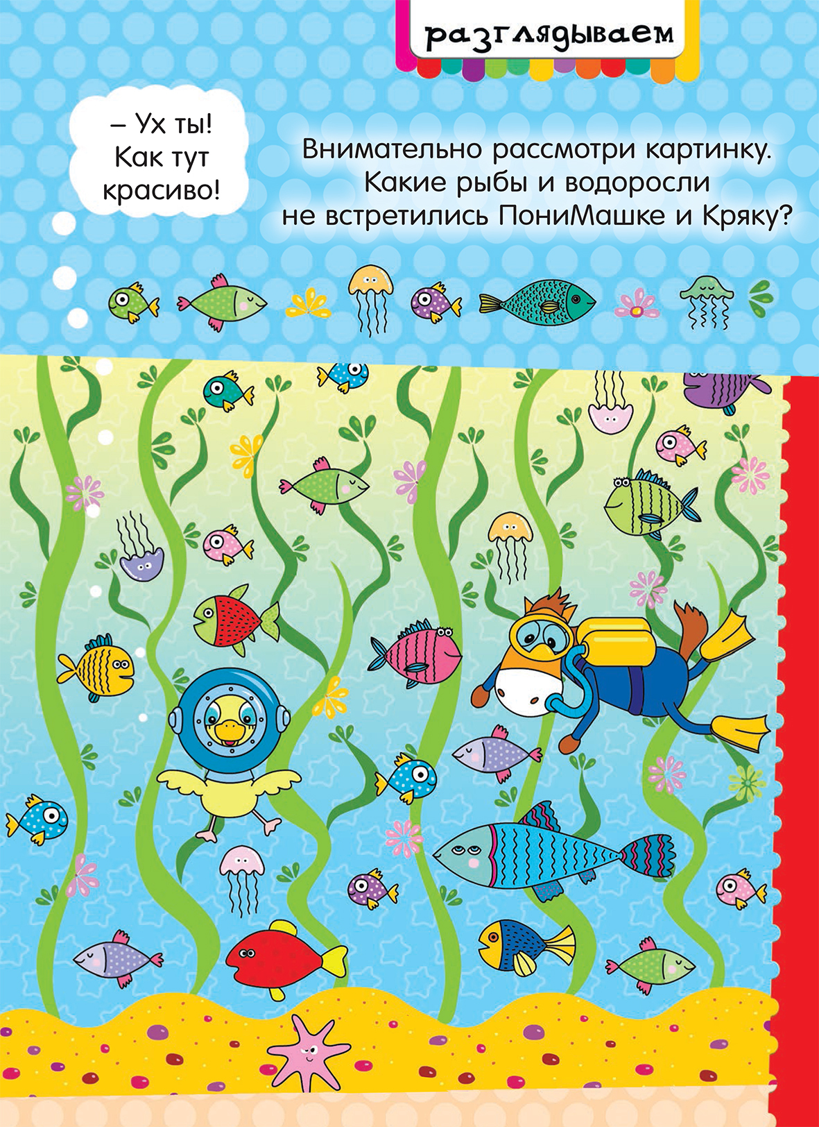 Упражнение для самых внимательных! Тщательно рассмотрите представленных наверху рыб и водоросли. Ребенку предстоит показать тех рыб и водорослей, которых нет на картинке. Чтобы упростить малышам задачу, можно попросить их сначала обвести ручкой те предметы, которые встречаются в ряду над картинкой. Затем методом исключения назвать те, которые ему не встретились. Дети постарше могут попробовать сразу найти нужные детали. Для удобства выполнения задания картинку можно распечатать.