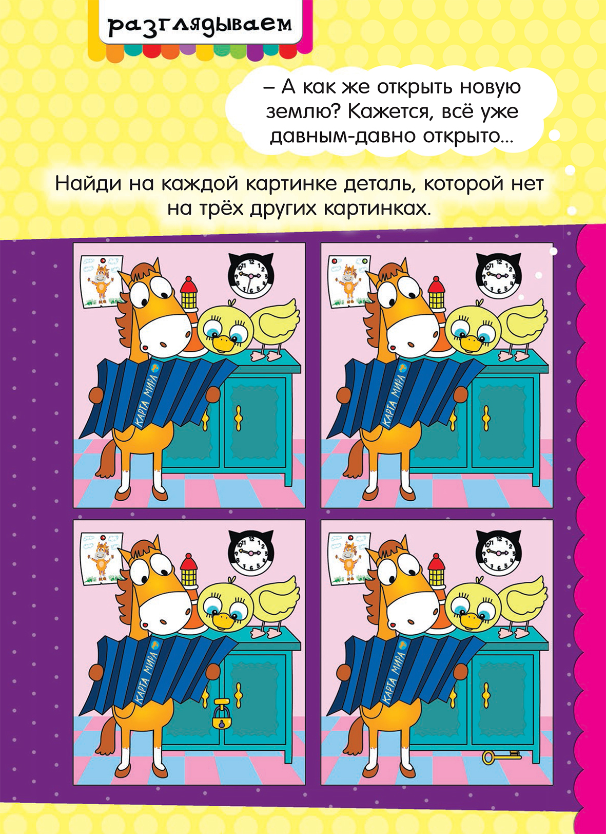 Это задание предназначено для очень внимательных детей и их родителей. Перед нами 4 почти одинаковых картинки. Однако на каждой из них есть деталь, которой нет на трёх других картинках. Необходимо внимательно рассмотреть все картинки и найти эти детали. Не останавливайтесь на достигнутом! Вместе с ПониМашкой и Кряком изучите карту мира. Можно вспомнить с ребенком стороны света, названия материков, вместе пофантазировать, куда бы вы хотели отправиться в путешествие.
