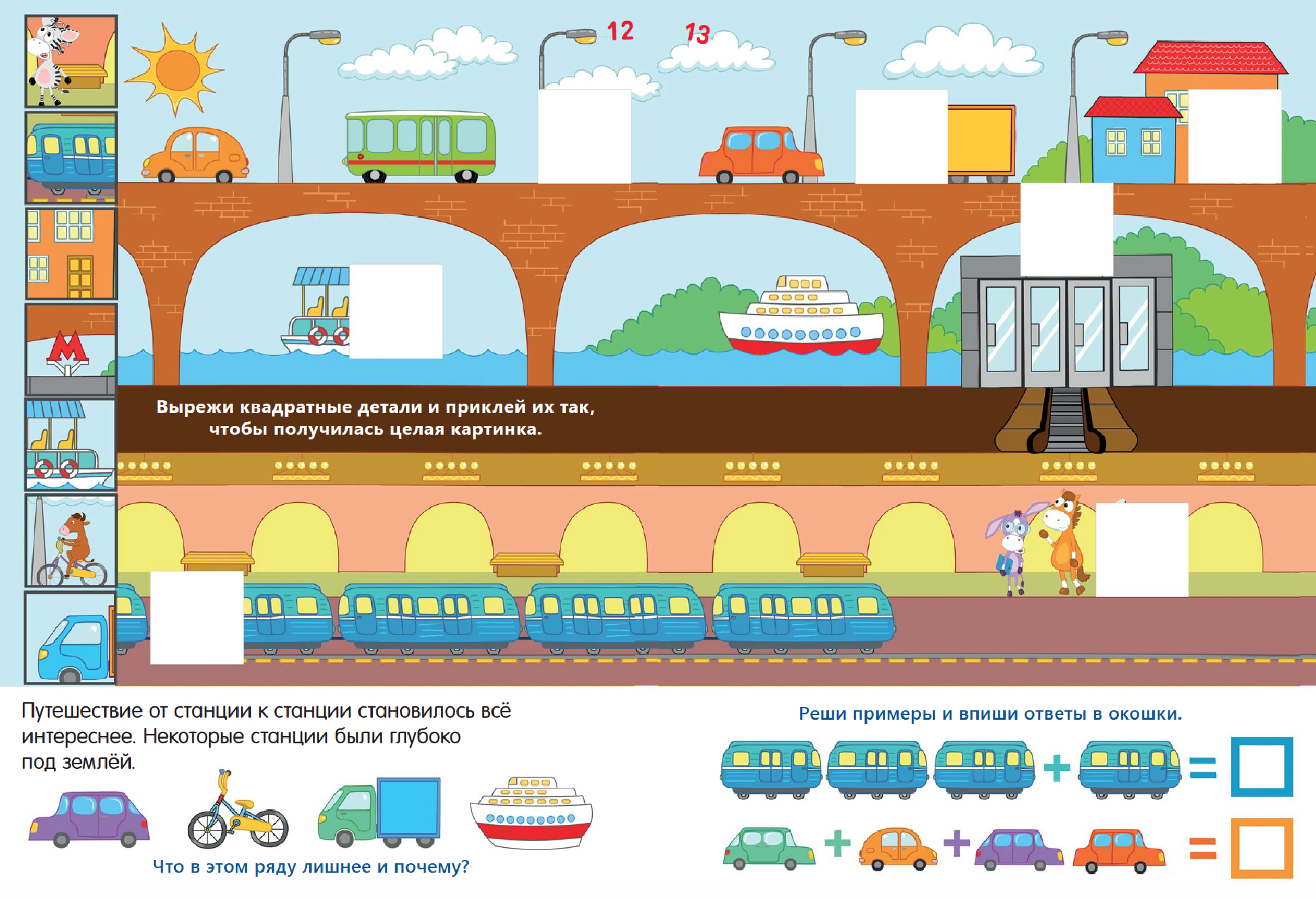 ПониМашка с друзьями решили доехать на метро до парка. По дороге они увидели много транспорта. Машина, пароход, автобус. Предложите ребенку внимательно рассмотреть картинку. Назовите все виды транспорта. Порассуждайте, кто может передвигаться на нем. Вспомните, где вы в последний раз видели велосипед или грузовик.