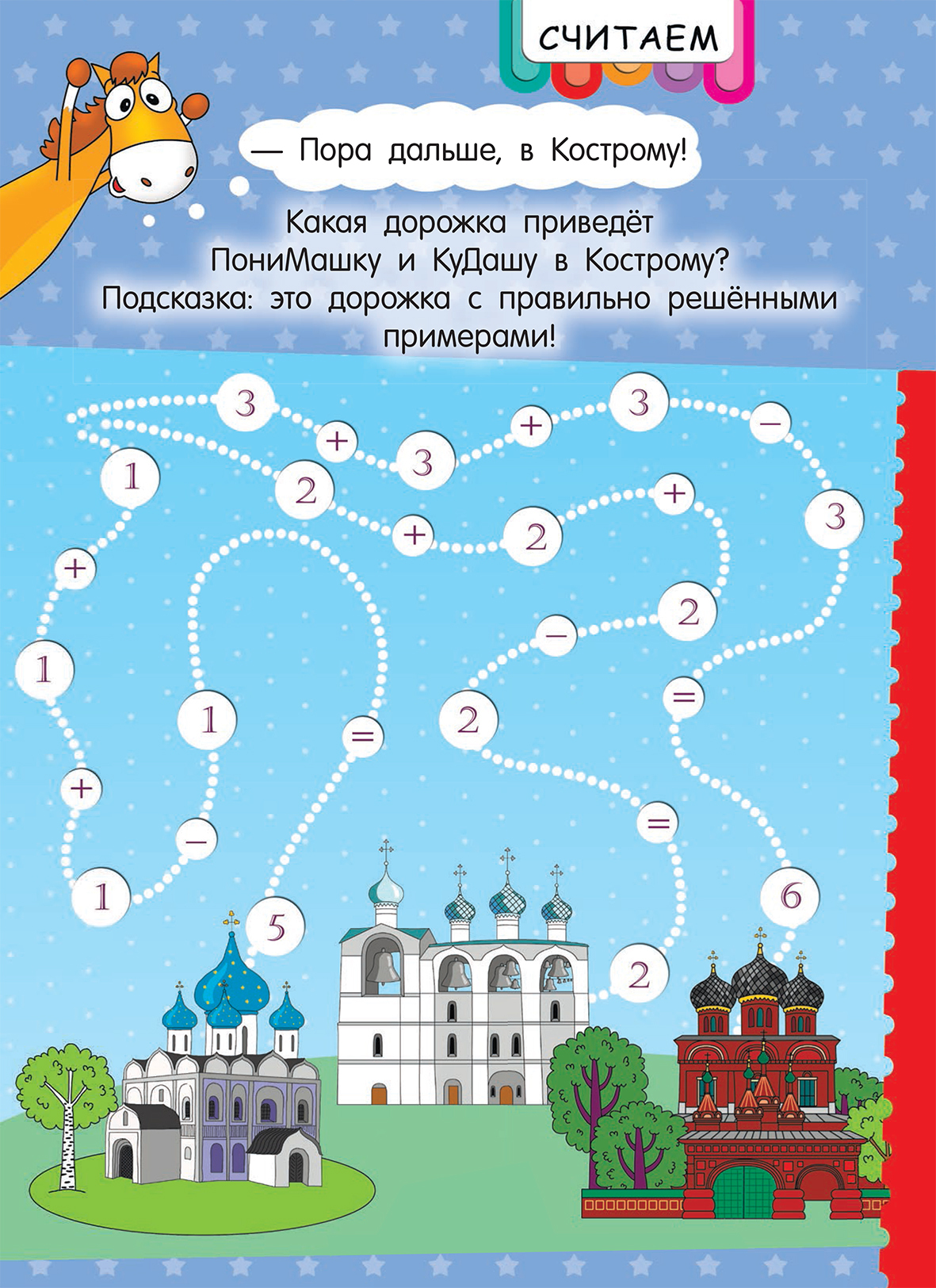 ПониМашка и Кудаша отправились в город Кострома. Помогите им найти правильный маршрут. А для этого решите 3 примера. Из них правильный только один - он и будет дорожкой к Костроме. Такие задания называются математический лабиринт. Они в игровой форме помогают освоить навыки счета.