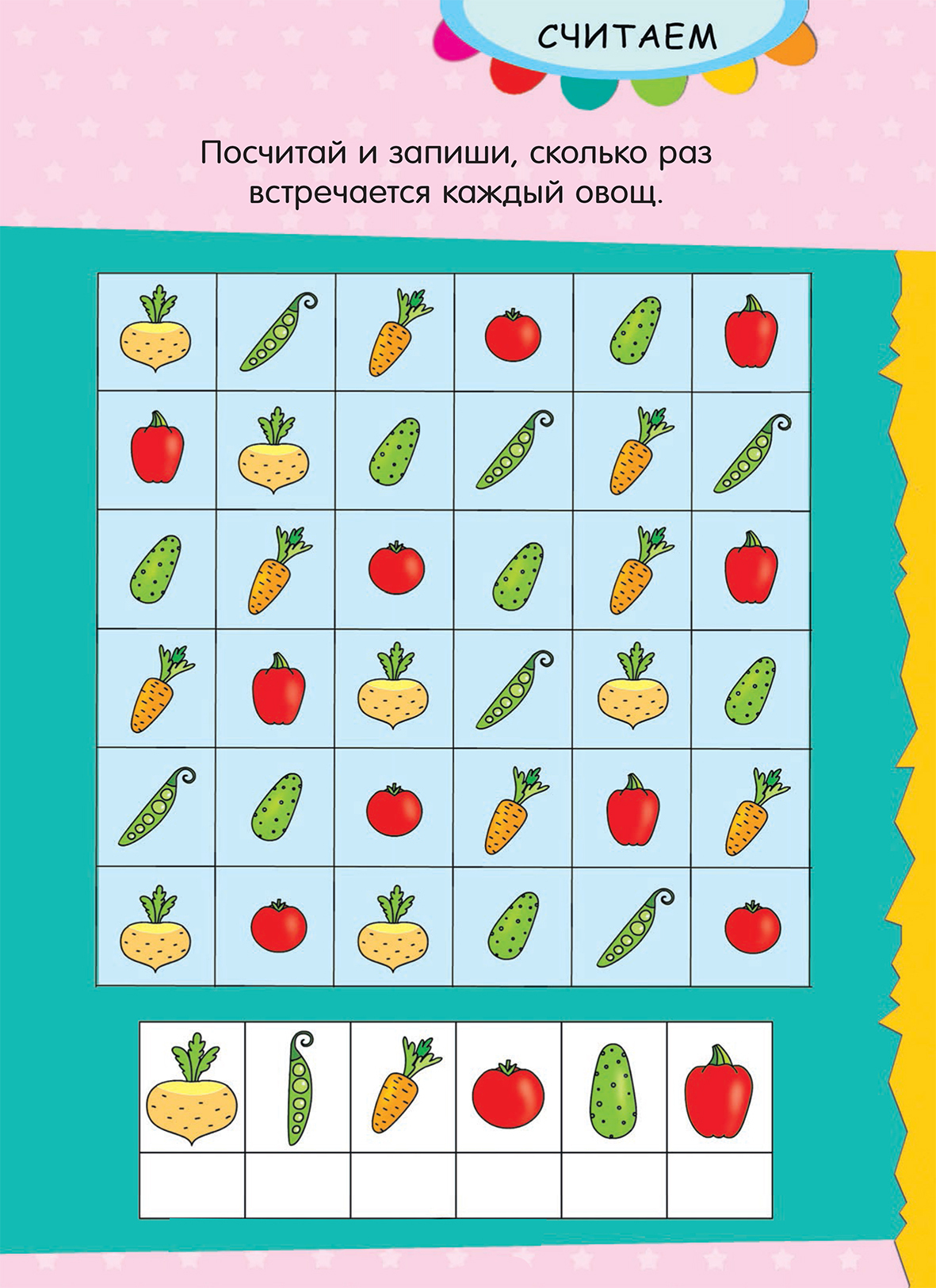 Распечатайте наше задание и посчитайте, сколько в ней огурцов, гороха, репки и помидоров. Правильный ответ запишите под табличкой. Обсудите с ребенком, каких овощей больше всего, а каких меньше.