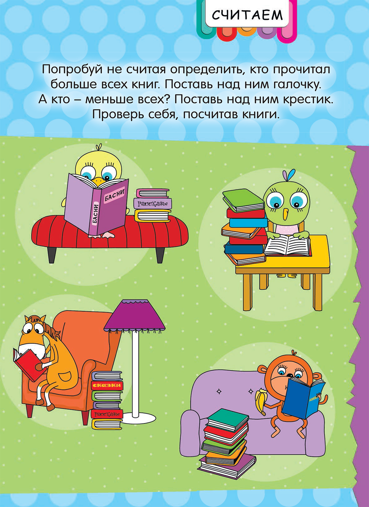 Рассмотрите с малышом картинки. Пусть ребёнок попробует, не считая, визуально определить, кто прочитал больше всех книг — Кряк, ПониМашка, Кудаша или Янка! Над правильной, по мнению ребёнка, картинкой нужно поставить галочку. А кто прочитал меньше всех — над тем ставим крестик. Проверьте малыша: теперь он должен вслух посчитать книги. Упражнение помогает вспомнить правила счёта и цифры, а также учит понятия «Больше-Меньше».