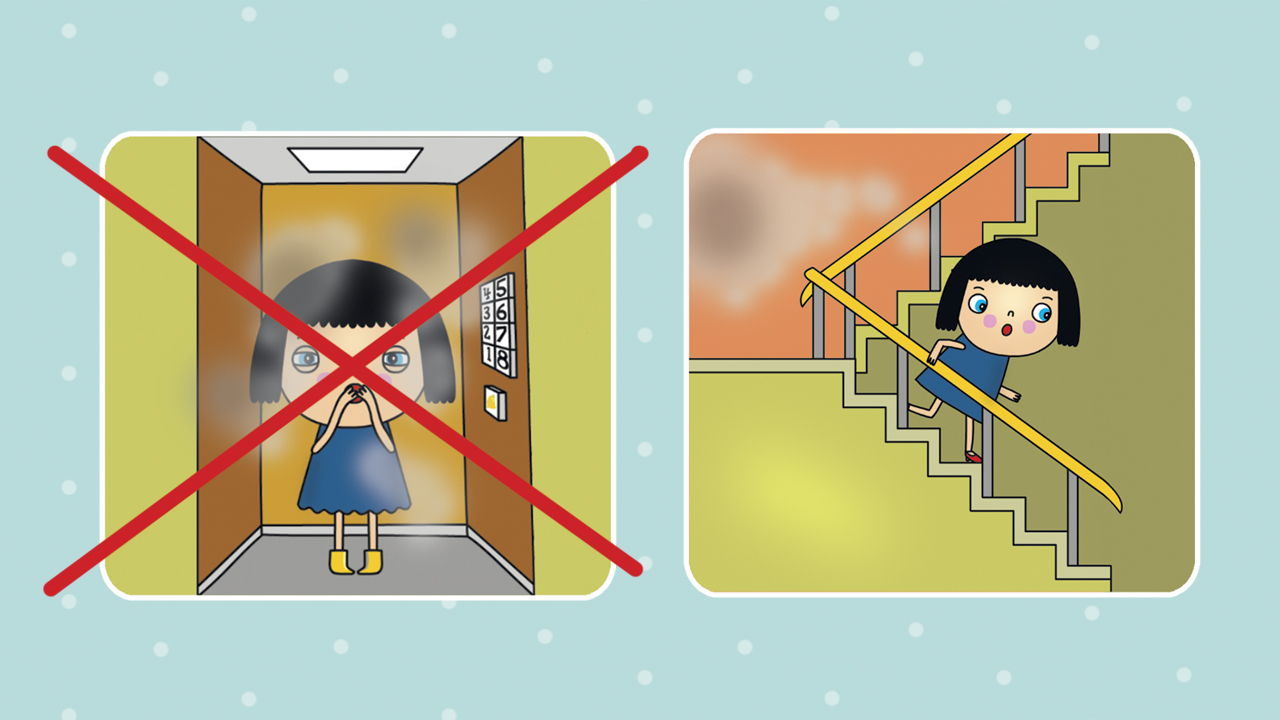1. Во время пожара не пользуйтесь лифтом. Спускайтесь по лестнице.